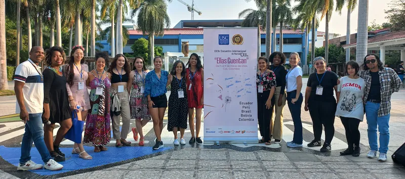 El encuentro de narradoras orales “Ellas Cuentan”, que a marzo de 2026 celebra su vigésimo séptima versión, nace de la mirada soñadora de tres mujeres muy jóvenes que, en el año de 1999, se reunían en la casa de una de ellas a tomar chocolate caliente. Ese aroma dulce, aromático y travieso alentó la valentía en el corazón de Linda Gallo Bedoya, una extrovertida, sonriente y desparpajada estudiante de Derecho, en quien en realidad habitaba una talentosa y creativa artista escénica. De Ángela Valencia, también estudiante de Derecho, reflexiva y sobria, con el porte y elegancia que distinguen a las mujeres afro, en quién habitaban los cuentos de su abuela con el acento y el ritmo de la costa pacífica; y yo, Cindy Milena Posada Montoya, una estudiante de Artes Plásticas que intentaba ponerle un rumbo a mi latente sensibilidad creativa entre las imágenes y las palabras.