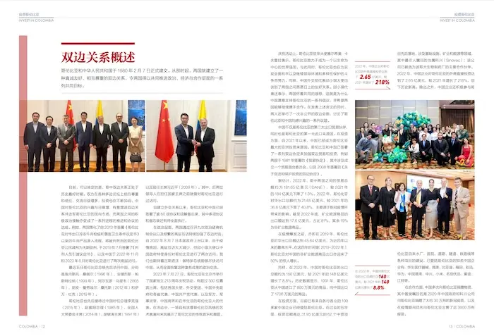 Invest in Colombia es una publicación seriada de la Embajada de Colombia en Beijing. Su edición anterior fue en el año 2020, y para este número contó con la dirección editorial de Luis Jorge Roa, primer secretario de la Embajada. En la carátula, Cali aparece representada por una pareja bailando salsa y entre los artículos encontramos uno titulado “卡利——莎莎舞之都” (“Cali, capital de la salsa”).
