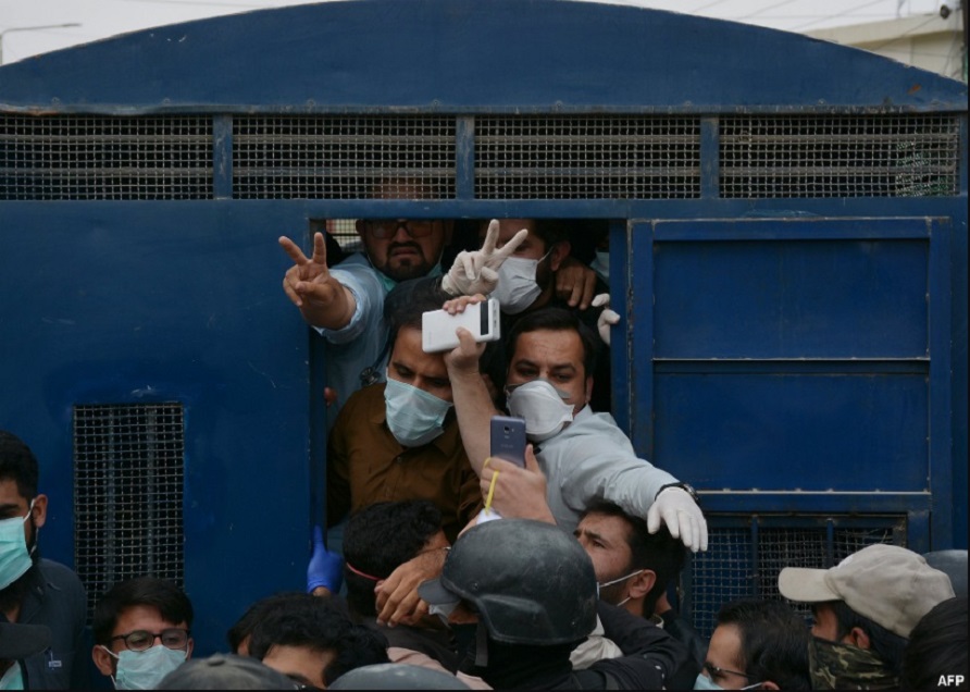 Médicos y paramédicos hacen gestos después de ser arrestados en Quetta, en el sur-occidente de Pakistán.