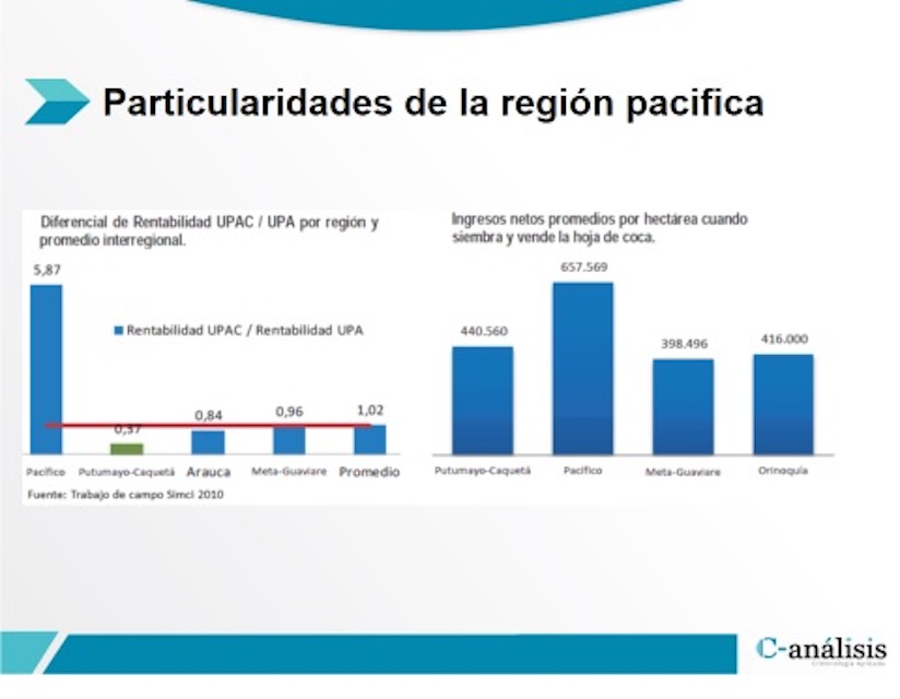 En el Pacífico colombiano el ingreso promedio de una familia cultivadora de coca es 5.8 veces más alto que el ingreso de una familia que no produce coca, una familia campesina rural. Realmente la brecha en la generación de ingresos de cultivos legales versus ilegales en el Pacífico es muy drástica. Esto no quiere decir que los productores de hoja de coca se estén haciendo multimillonarios, que la coca se esté pagando exponencialmente alta, es que los ingresos asociados a la legalidad son muy bajos. En el resto del país no es tanto. En el Putumayo, en el Caquetá, por ejemplo encontramos que el productor de hoja de coca recibe en promedio una tercera parte, o sea mucho menos que lo que recibe un productor de un producto legal.