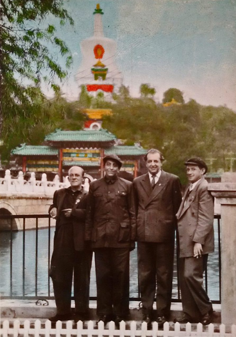 Foto iluminada de Alipio Jaramillo, Diego Montaña Cuellar, Jorge Zalamea y Sr. Barragán, en el lago Beihai en Beijing 1952. Cortesía del Archivo Jorge Zalamea Borda.
